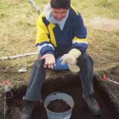 Gerald Tetlichi holding a barbed antler spear point he excavated at the Fort McPherson site in 2002.