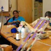 Seamstresses Ruth Wright, Bella Norman and Ida Stewart beading during the Aklavik clothing workshop held in March 2002. Note handmade wooden beading loom and modern beading loom. These were primarily used for the decoration on the pant legs.