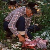 Robert Alexie butchering a beaver while camped at Gyuu Dazhoo Njik (Snake River)  during the 1996 Teetl'it Gwich'in Place Names Project.