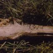 Wooden snow shovel lying on the surface at a traditional winter camp in the Caribou River area during the Peel River Ethno-Archaeology Project 2000.
