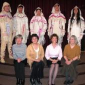 Gwich'in models and project co-ordinators at the unveiling ceremony of the 19th C. Gwich'in Traditional Clothing Project at the Prince of Wales Northern Heritage Centre, Yellowknife on March 28, 2003. (Back l-r): Adolphus Lennie, Brandon Albert, Ryan Vittrekwa, Ryan Moore, Chas Saddington. (Front l-r): Judy Thompson, Karen Wright-Fraser, Ingrid Kritsch, Joanne Bird.