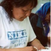 Audrey Snowshoe working on the Aklavik outfit during the Tsiigehtchic workshop held in July 2002.