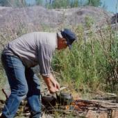 George Niditchie preparing tea along the Arctic Red River at Eltyin Choo Chihvyàh K’ìt during the Gwichya Gwich'in Place Names Project, 1993.