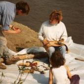 Archaeologist Eric Damkjar shows Yvonne Andre how to make stone tools while Erika Kritsch looks on. Photo taken during the GSCI Gwich'in Science Camp (Martin Zheh Ethno-Archaeology Field School) up the Arctic Red River in 1995.