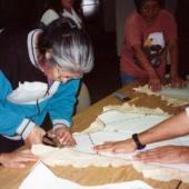 Ida Stewart cutting out the tunic for the 19th C. Gwich'in man's summer outfit using a pattern drawn by Dorothy Burnham and provided by Judy Thompson of the Canadian Museum of Civilization during the December 2000 workshop in Yellowknife.