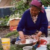 Eunice Mitchell preparing bannock near Chuu Tr’idaoodìich’uu (Peel Canyon) during the 1996 Teetl'it Gwich'in Place Names Project