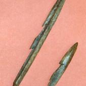 Antler and bone projectile points found by Woody Elias in 1999 at the Fort McPherson archaeological site.