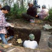 Yvonne Andre, Celina Jerome, Brenda Kendo and Jenny Andre with Nap and Annie Nortbert at the Gwich'in Science Camp (Martin Zheh Ethno-Archaeology Field School) excavation in 1995.