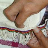 Sewing the mitts during the Tsiigehtchic workshop held in July 2002 . Note the porcupine quill wrapped fringes.