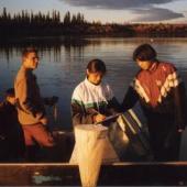 Dave Jones, Ramona Bonnetplume and Frederick Arey testing the water quality of the Peel Channel at the Knut Lang Camp during the 1997 Gwich'in Science Camp.