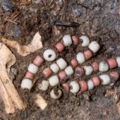 Red and white glass trade beads found in-situ during excavation at the Martin Zheh site up the Arctic Red River in 1995.