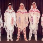 Charles (Chas) Saddington, Brandon Albert, Adolphus Lennie, Ryan Moore and Ryan Vittrekwa modelling the replicated traditional caribou skin clothing at the unveiling ceremony at the Prince of Wales Northern Heritage Centre in Yellowknife on March 28, 2003.