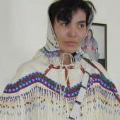 Seamstress Shirley Stewart of Fort McPherson, trying on the Inuvik outfit during the Aklavik workshop held in March 2002.