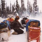 Daryl English readying his sled at Walter and Robert Alexie's camp near Tr’atr’aataii Tshik (Trail River) during the skidoo trip between Fort McPherson and Mayo in March 1998.
