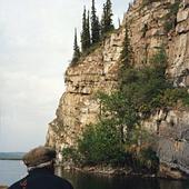 This place name refers to a prominent cliff on the eastern side of Campbell Lake, in the Gwich’in Territorial Park outside of Inuvik. The cliff is visible from the Dempster Highway and, if you stand on top, it provides a spectacular view of the Mackenzie Delta. The first name refers to a time long time ago when people climbed this cliff to collect eagle feathers to fletch the ends of their arrows. The second name refers to the seagulls that used to nest along this cliff. There were so many that this cliff was described as being "white" with large seagulls. Annie Norbert recalled that when her father used to hunt ducks here, it was difficult to talk to one another because of the noise that the seagulls made. Today there are no seagulls here.