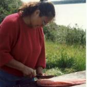 Grace Blake cutting fish at her camp at Teetshik Goghaa (Six Miles) along the Mackenzie River.