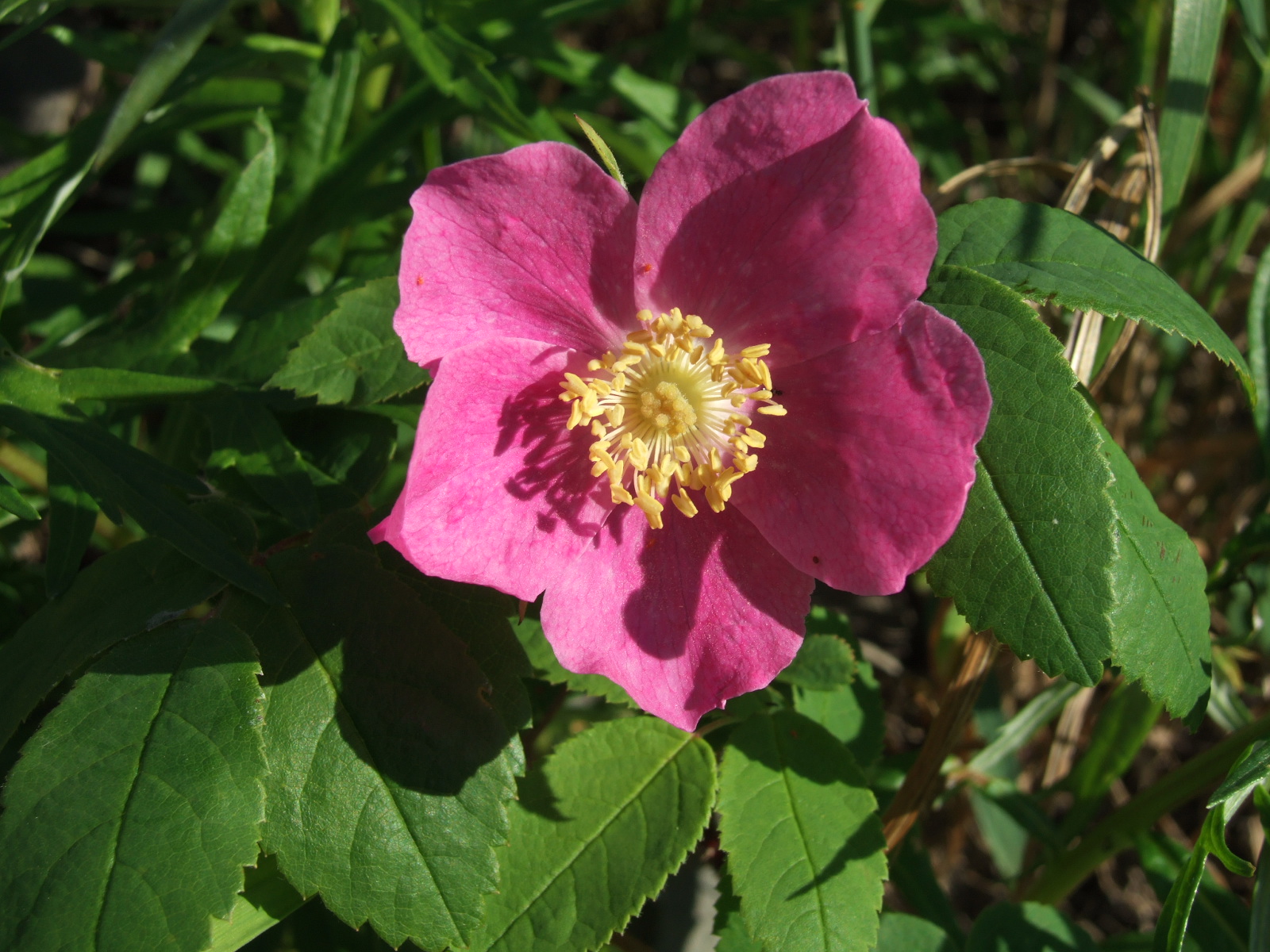 After the showy pink flowers bloom in June and July, the fruit develop into red berries called rose hips. The red berries are best picked and eaten when they are ripe in August and September. Remember to spit out the seeds before swallowing or you will quickly learn why rose hips are called “itchy bums!” Rose hips can also be fried and eaten. Boiled rose hips can be mashed and strained through a cheese cloth to remove the seeds. The strained juice can then be made into jam, jelly, or syrup. In early summer, green rose hips can be picked, boiled and strained to make a thickening agent, like Certo. Green rose hip juice can either be used immediately or stored in jars for later use.