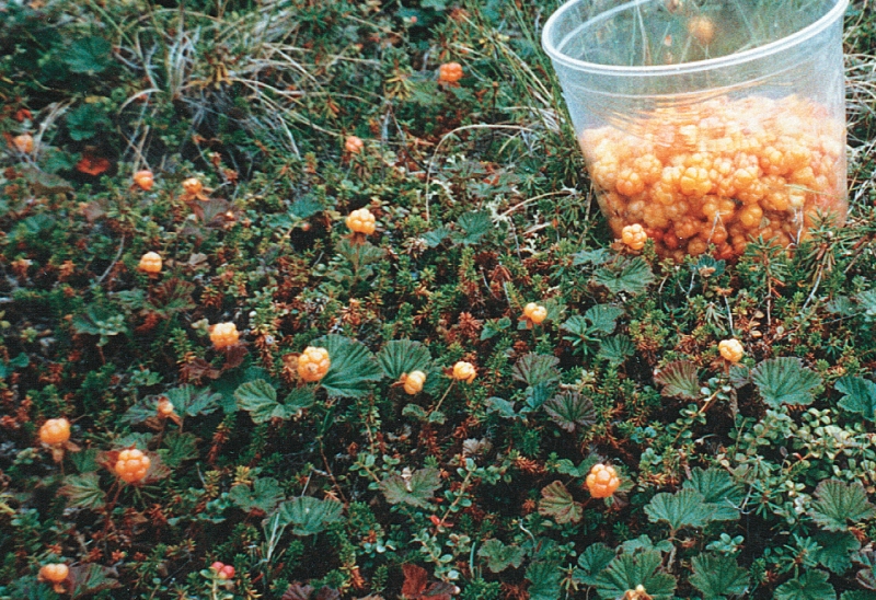 The white flowers come out in June and the berries which resemble orange raspberries, are ready to pick in late July when they are soft and plump. Along with blueberries and cranberries, yellowberries are a favourite in the area. People usually eat them right away, or save them for a special occasion or to give away as a gift. In the old days people stored yellowberries in birch bark baskets under the moss, where the permafrost kept them from spoiling and, in winter, from freezing too hard.