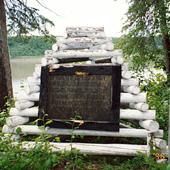 Just upstream from here, on the left bank of the Peel River is the location of one of two monuments to the Royal North West Mounted Police “Lost Patrol.” The two monuments commemorate the places where the bodies of the four RNWMP men were found who became lost and perished during their patrol between Fort McPherson and Dawson City in 1911. This monument marks the location of the bodies of Constables Kinney and Taylor, found by Special Constable Charlie Stewart, Sarah Simon’s father. The monument is built of logs stacked horizontally in the shape of a pyramid and painted white. A wooden plaque attached to the monument reads: “On this site Csts. C.F. Kinney and R.D.H. Taylor, R.N.W.M.P., perished February 1911, while returning to Fort McPherson after an unsuccessful attempt to patrol to Dawson, Yukon by dog team.” Inspector Fitzgerald and Special Constable Carter died downriver from here. All of the men were buried in the Fort McPherson Anglican Church cemetery.